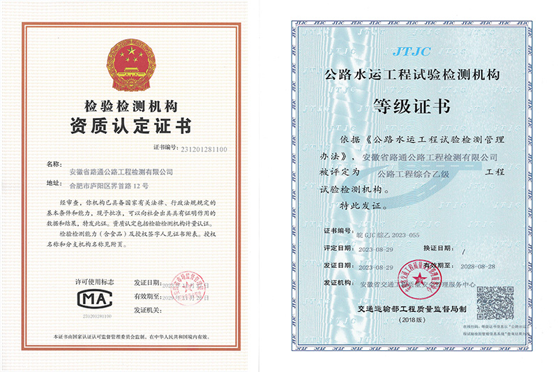 安徽省路通公路工程检测有限公司成立于2003年7月。现拥有公路工程综合乙级检测资质、排水管道检测及评估作业能力III级作业证书,并通过了检验检测机构资质认定。2021年12月16日,获批“高新技术企业”。各专业试验检测人员配备齐全,具备开展集料、钢材、土工、沥青及沥青混合料、水泥及水泥混凝土、砂浆、无机结合料、水、外加剂、砖以及路基路面、混凝土结构物、基坑地基与基桩、桥梁结构、交安设施、公路与桥梁技术状况和城镇排水管道检测等多项试验检测的能力。